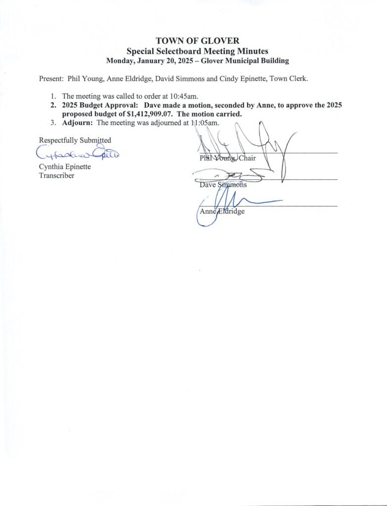 Announcements | Select Board | Select Board Meetings Glover Selectboard Meeting Minutes Draft 2-5-26 ByTown Clerk February 10, 2026 Share this: Share on X (Opens in new window) X Share on Facebook (Opens in new window) Facebook Print (Opens in new window) Print Email a link to a friend (Opens in new window) Email